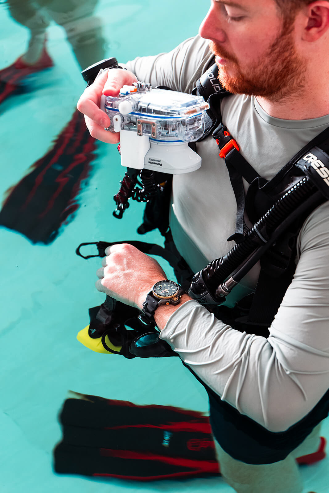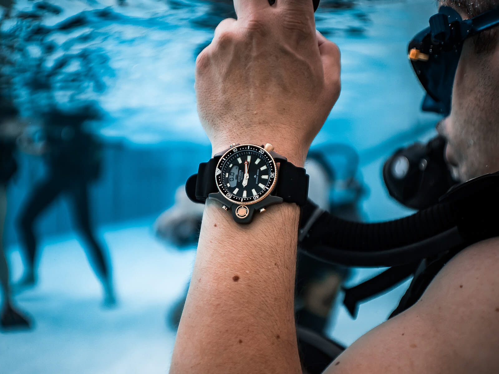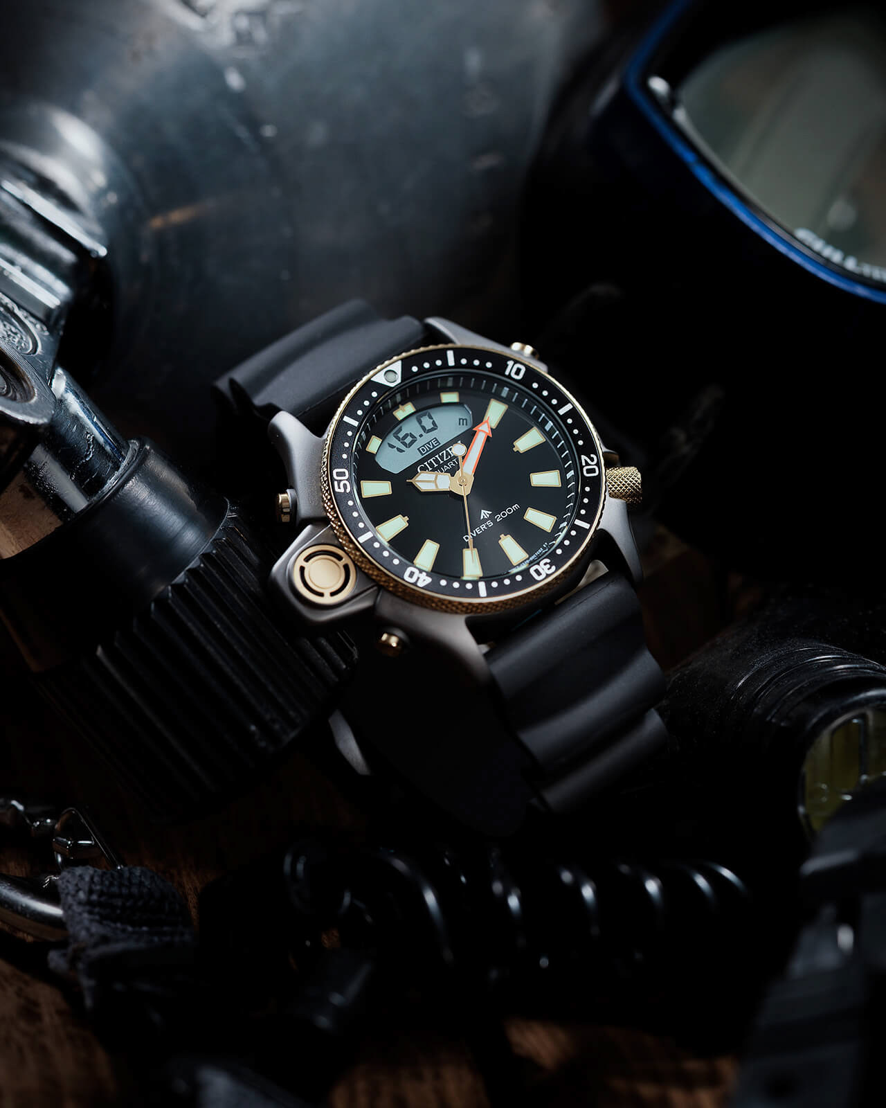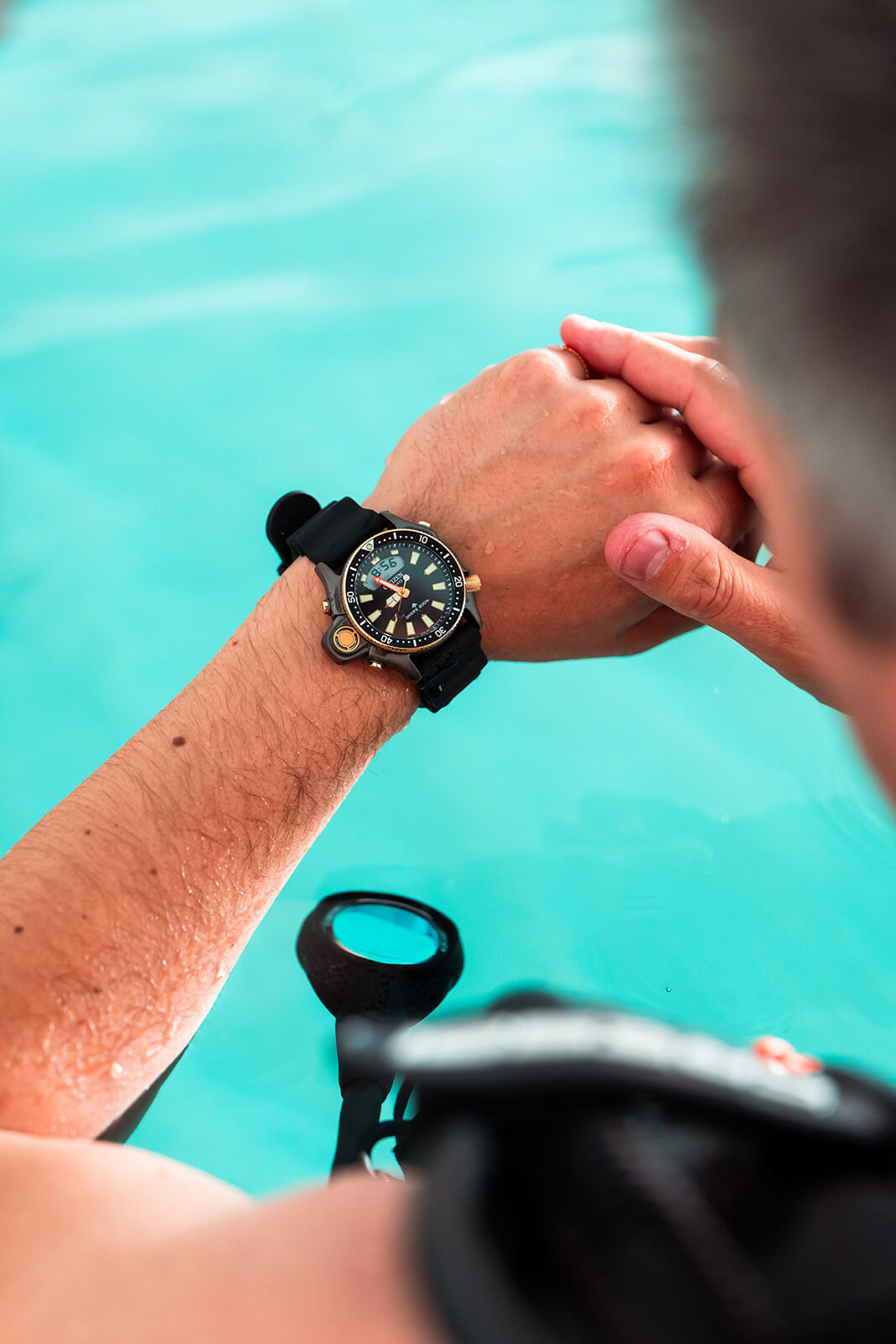 Al polso, l’orologio Citizen Aqualand. Un compagno affidabile pensato proprio per l’immersione. Durante l’esperienza, lo strumento registra profondità, tempi e dati essenziali. È molto più di una prova. È l’ingresso in un mondo nuovo, fatto di silenzio, respiro e leggerezza.